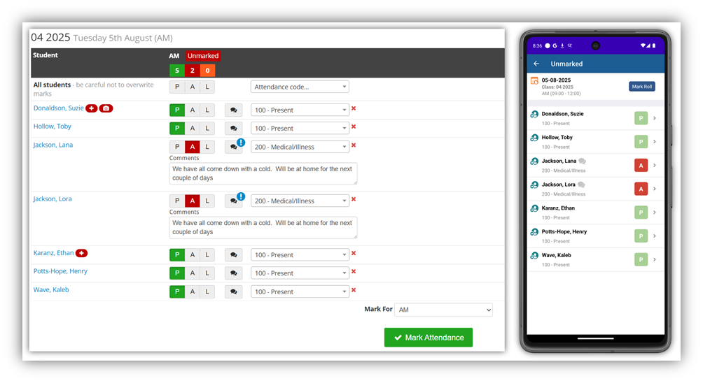Attendance presets allow for automatic allocation of attendance codes and reasons, including management of planned study free periods. Attendance comments are available for both roll marking, absent notes raised and attendance presets where additional information is required.