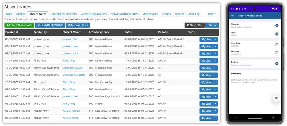 Comprehensive tools exist for the handling of absences. Absent notes can be raised by parents and staff depending on the communication received.