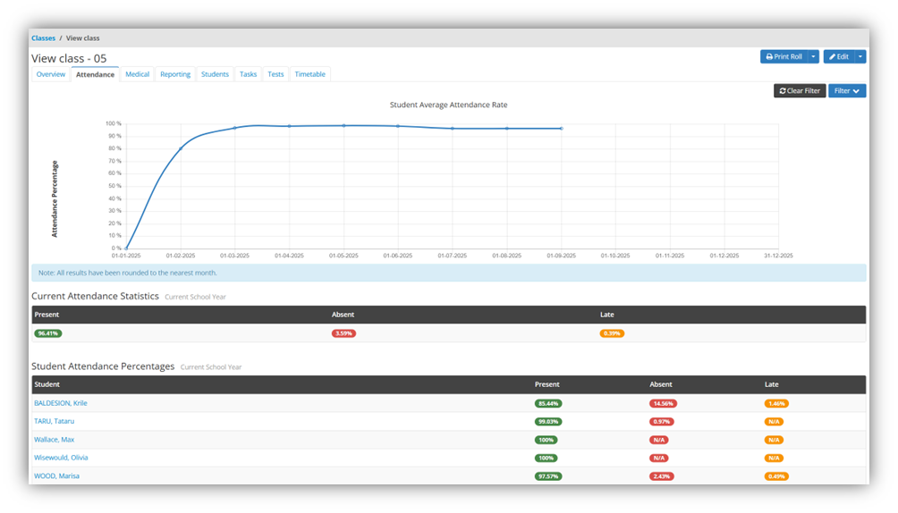 The system supports daily roll creation with automatic generation of AM and PM rolls for primary schools. For secondary settings, multiple period-based rolls can be generated per class or subject to ensure compliance with period-by-period attendance requirements.