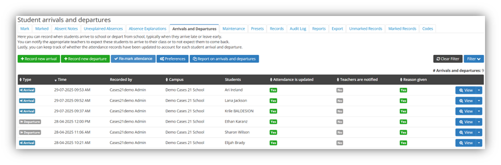 Where the school chooses not to implement the Kiosk, arrival and departure records can be directly created by administration staff including the ability to notify class teachers of the arrival / departure.